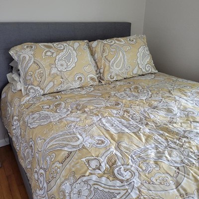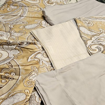 - Complete comforter and sheet set featuring a modern all over paisley print using a combination of wheat, grey, brown, and white colors