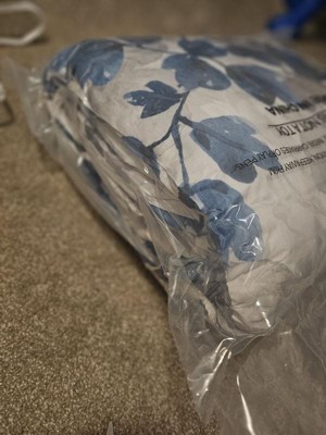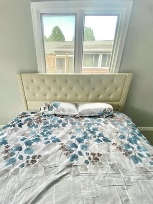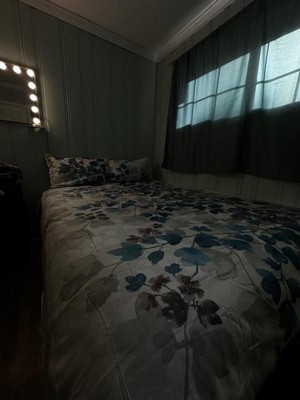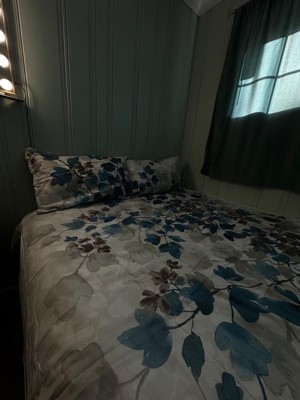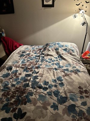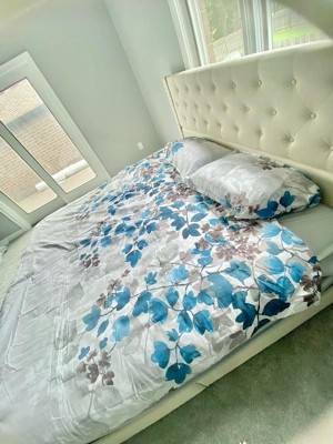 - Complete modern botanical bed set with comforter and sheet set featuring blue and gray leafy floral print