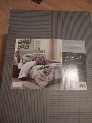Make a bold fashion statement in your bedroom with the Madison Park Essentials Claremont Comforter Set with Cotton Sheet Set. A large scale bright purple and black floral print covers the grey comforter, creating a striking look. The solid purple reverse complements the top of the bed, while matching shams (1 for Twin Sizes) pair perfectly with the comforter. One bright purple decorative pillow adds another dramatic touch and a complete sheet set with an ogee print completes the set. Bringing the best in health and wellness, this bedding set also features an anti-microbial treatment that provides built-in freshness protection, reducing the growth of odor causing bacteria and keeps fabric lasting longer. This bedding set is also OEKO-TEX certified, meaning it does not contain any harmful substances or chemicals, ensuring quality comfort and wellness. This bedding set may come in rolled or compressed packing and will need to be fluffed up. Use a steam iron to help remove wrinkles easier.