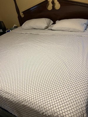 [This review was collected as part of a promotion.] It's very soft, silky, and comfy. It's fits our King sized bed perfectly. The sheets and pillow cases are White and Purple lattice work while the comforter is a silky grey and purple floral. It comes with (King sized) both sheets, four pillow cases, sham, and little pillow.