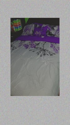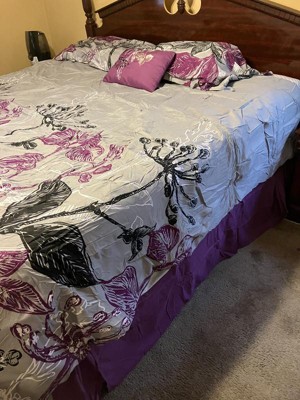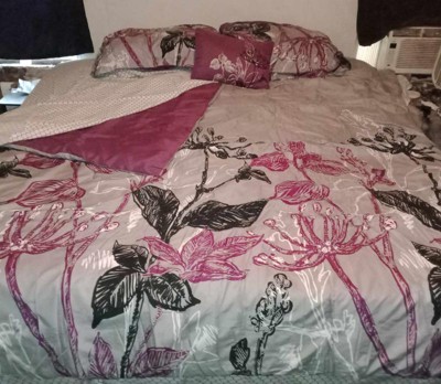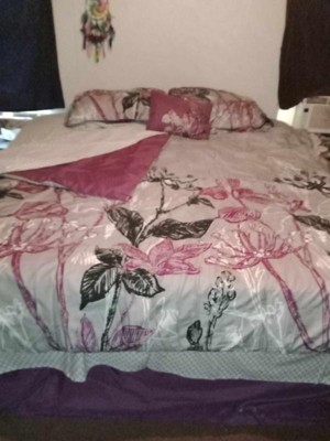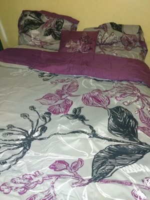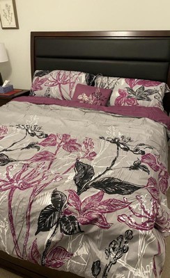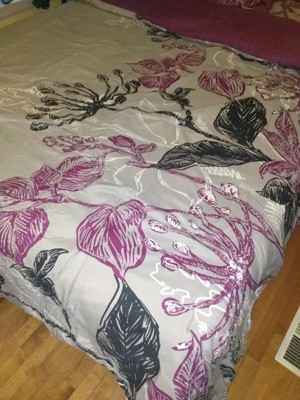 - Transitional large scale bright purple and black floral print on grey comforter set with 100% cotton printed sheets