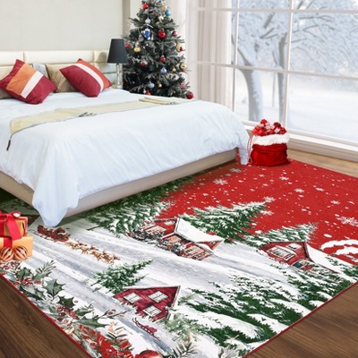 9x12 Christmas Area Rugs, Washable Non-Slip Snowflakes Snowscape Carpet, Soft Low Pile Foldable Stain Resistant for Bedroom, Home, Red