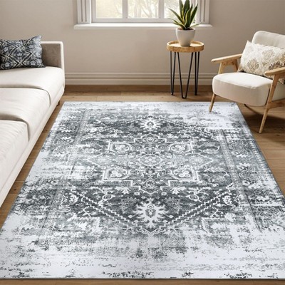9x12 Vintage Washable Rug, Gray Low-Pile Non-Slip Non-Shedding Distressed Carpet for Bedroom & Living Room