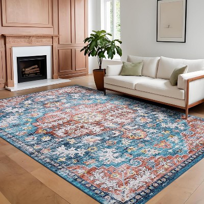 9x12 Washable Boho Area Rug – Marble Distressed Farmhouse Design, Ultra-Thin, Non-Slip Large Carpet for Bedroom, Kitchen, Dining – Blue