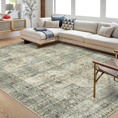 9x12 Washable Modern Neutral Rug, Beige Low-Pile Non-Slip Soft Carpet for Living Room, Bedroom & Farmhouse