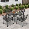 This 5-piece patio furniture dining set is crafted from rust-resistant and weather-resistant cast aluminum frames with high-performance powder coating, ensuring durability and against rust, scratches, and rays. Each chair is ergonomically designed for comfort and comes with cushions, while the stackable design saves storage space. The table's hole (1.88" diameter) allows for shaded relaxation during sunny or rainy days. Adjustable feet ensure stability on uneven surfaces. Assembly is quick and straightforward, with all hardware and instructions provided.