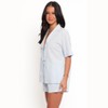 Short sleeves make this top ideal for warmer weather, allowing you to stay cool and comfortable while looking fabulous. One of the standout features is the front tie closure in a calming pale blue color.