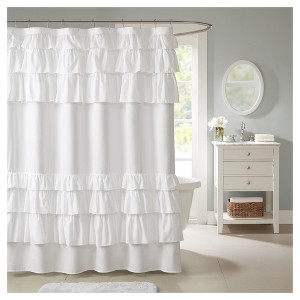 Abby Ruffle Shower Curtain Solid White: Madison Park, Polyester Microfiber, Machine Washable, Buttonhole Top