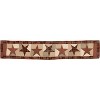 Create a warm and welcoming table for friends and family to gather round with primitive colors and quilted details. The Abilene Star Quilted Runner includes one table runner made from 100 percent cotton. Warm and rich tones of burgundy, tan and dark brown are joined in array of classic checks and tartan plaid prints in a rustic patchwork with a soft feel. At the center of the design is a series of bold, 5-point stars for an elegant, Americana look. The classic country table runners reverse to a burgundy and tan tartan plaid with soft country black striping. Complete your tabletop decor with other pieces from the Abilene Star Collection by VHC for a coordinated modern primitive look.