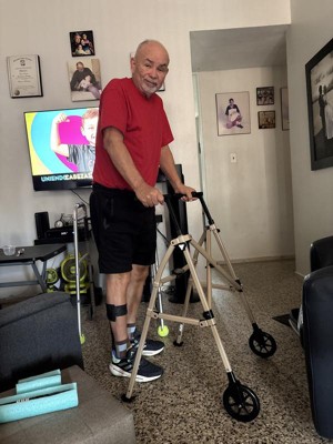 I purchased the walker for a family member. This was a great fit as it is very adjustable and can quickly fold when traveling by car. It would be great if the walker had a brake on the wheel to stop the walker from sliding forward on wood floors.