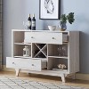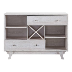 With a modern perspective, this buffet sets up a well-balanced array of storage. It houses a middle wine rack enveloped by a total of four open shelve chambers and 2- long drawers on metal glides. Not only do these drawers open with fluid efficiency, but they also star silver knobs for a refined touch.