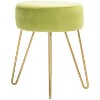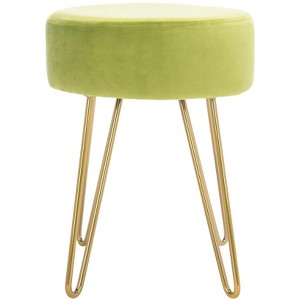 Introducing the Abrea Round Ottoman in a captivating pear and gold finish, a delightful addition to any living space. This ottoman combines elegance and utility, offering a chic accent or practical seat. Its round shape is complemented by the lush velvet cover, providing a soft touch. Beneath, a robust steel frame ensures stability and strength, promising daily enjoyment. The foam cushioning provides a comfortable feel, enhancing relaxation in any room. Adding visual interest, the sleek gold legs add a modern twist, making this ottoman a versatile piece for various interiors. Perfect for the living room or bedroom, its compact design easily fits into your decor while drawing attention with its vibrant color and sophisticated style. Transform your space with the Abrea Round Ottoman, where style meets function seamlessly.
