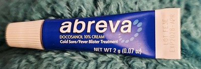 Abreva 10% Docosanol is a cold sore treatment that helps shorten healing time of cold sores (1). Formulated with 10% docosanol, this fever blister and cold sore medication helps to shorten the duration of tingling, pain, burning and itching associated with cold sores if used as directed at the first sign of a tingle. Abreva Cold Sore Treatment penetrates deep (2) to create a barrier around healthy skin cells to prevent the spread of herpes simplex virus type 1 (HSV-1). Abreva Cold Sore lip treatment is a nonprescription cold sore medicine approved by the FDA to shorten healing time to heal cold sores in as few as 2.5 days (1). This healing cream should be applied 5 times a day until your cold sore is fully healed, for a maximum of 10 days. This Abreva 10% Docosanol tube is easy to apply and take on the go for whenever you need a cold sore treatment for lips.