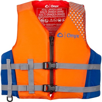 The Onyx Adult Select Life Jacket features large mesh storage pockets and fleece-lined handwarmer pockets. Reflective material on the front and back add visibility for your safety. US Coast Guard approved. Features: Soft, fleece lined, fiber-fill collar. Two zippered chest pockets; pliers pocket. D-ring attachment for small accessories.