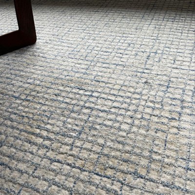 Beautiful rug! Love the thickness and texture. Description is accurate in my opinion… it is ivory with charcoal grey and light, blue-ish grey lines running across it. I am very happy with with rug!
