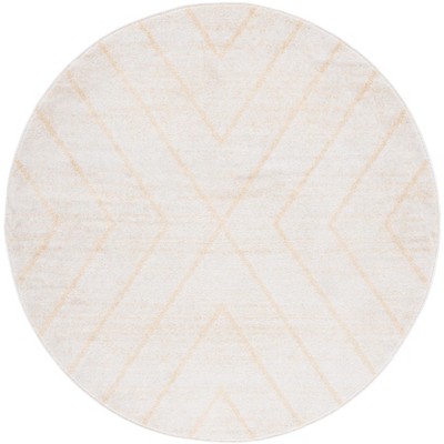 Transform your living space with our luxurious hand-tufted round area rug, crafted from a premium blend of 80% wool and 20% cotton for unmatched comfort and durability. Made in India, this 6' x 6' round rug boasts a sleek 1/4" pile height and features an elegant ivory and gold color palette that exudes contemporary sophistication. The textured pattern adds a touch of modern artistry to your floor, enriching your home with its subtle charm. While it's not machine-washable or slip-resistant, its quality construction ensures lasting beauty in your home. Add a dash of style and warmth to any room with this exquisite piece.
