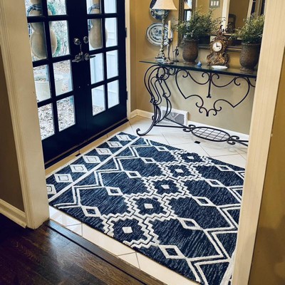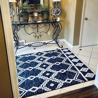 I can’t say enough good things about this rug, it’s everything I expected and more. Hand tufted wool, heavy and well made. It rolled out flat immediately. I wasn’t looking for something soft, but rather thick with some weight, to be able to hold up to guests wiping their shoes on it. I can honestly say this would be able to handle the wear and tear while hiding the dirt. It’s a little over half an inch thick where my entry door easily clears it. The colors are beautiful, the navy area has powder blue strands mixed in while the ivory part has light gray strands mixed in. I had considered a runner but it just didn’t look right, many didn’t have the width or weight, so glad I went with a 4x6 and this thickness. I have added sticky grips underneath to hold it in place, I may add a thin rug pad if I notice it moving. The only con I will say is that it has a funky odor. I’m hoping over time it will fade. I’ve sprayed it with febreeze and that has helped some.