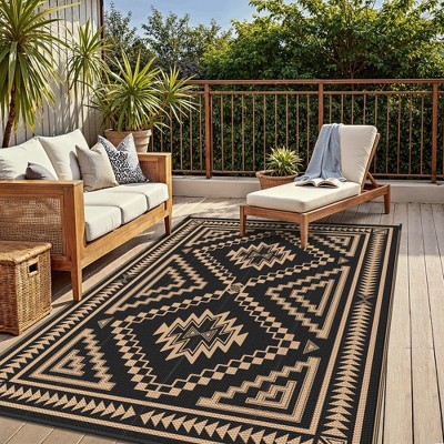 Enhance your outdoor or indoor decor with this versatile rug. Its reversible design allows you to extend its use time by simply flipping it, doubling its lifespan and adapting effortlessly to seasonal changes. Two classic geometric patterns offer a fresh look for your patio. The dark tone effectively hides dirt, maintaining a new appearance. Made of 100% premium polypropylene, it's eco-friendly and features edge heat treatment for durability. The tightly woven plastic is gentle on bare feet and protects surfaces. With professional UV coating, it resists sun damage, suitable for various weather conditions. Cleaning is a breeze, just wipe or shake, and it's portable too, coming with a carry bag. Ideal for patios, gardens, camping, and more.