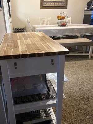 Love the kitchen cart especially for our smaller kitchen. I use it to store my baking pans and love the wooden acacia top & color makes have a farm house style & matches my dining table.
