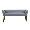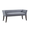 Accent your home with the simple elegance of the Madison Park Welburn Accent Bench. Upholstered in a Slate Blue fabric, this bench features a low back and flared arms that create a sleek and sophisticated look. A bronze nailhead trim adds elegant accent, while the light wood finish complements the upholstery. Perfect for your bedroom or living room, this upholstered bench provides a chic update to your home decor. Assembly required.