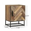 Add a unique touch to your bedroom with this handcrafted boho-style nightstand. Featuring a zig-zag slatted front and a reclaimed wood surface, this piece combines natural textures with an industrial iron frame for durability and charm. The single-door cabinet provides ample storage for your essentials, while the matte black handle and base enhance its modern silhouette. Designed to blend seamlessly into a wide range of interiors, this nightstand is both functional and stylish. Dimensions: 17.50" W x 14.00" D x 22.75" H.
