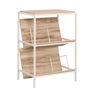Stylish storage solution to reduce clutterAdjustable tilted shelves for customized organizationSuitable for living room, entryway, or office useBrown woodgrain finish complements various decor stylesDurable powder-coated metal frame for long-lasting useCompact dimensions fit small spacesEasy to assemble with clear instructionsMulti-purpose storage for shoes, books, and decor for peace of mind