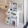 This compact vanity table set is perfect for small bedrooms, featuring a left-drawer layout and a large sliding mirror with integrated LED lighting. The mirror offers tri-color light modes—white, natural, and warm—controlled by a touch sensor, with adjustable brightness to suit different needs. Constructed from durable MDF, this vanity includes open shelving and drawers for efficient storage. The set comes with a cushioned stool for added comfort. Ideal for petite users, it fits seamlessly into tight spaces. The table is easy to assemble with included visual instructions and video support. Dimensions: 29.2 in W x 12.6 in D x 50.4 in H.