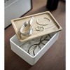 - [The recessed surface of the wooden lid doubles as a tray both when it's on or removed from the box, allowing for extra storage and display options.]