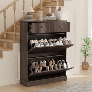 - This shoe organizer features two double-depth flip drawers and a spacious top drawer, allowing you to separate shoes by season, type, or household member. The multi-compartment layout ensures everything has its place, while the sturdy MDF frame provides long-lasting structure and stability. The smooth, modern finish wipes clean easily after daily use. Assembly is straightforward and all necessary hardware is provided.