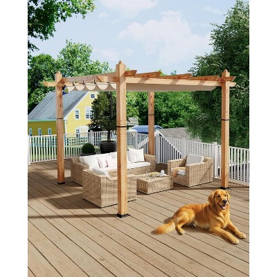 Acekool Aluminum Pergola with Retractable Canopy, Wood Grain Pillars, Khaki Curtain, Outdoor Sun Shelter, 10x10 FT