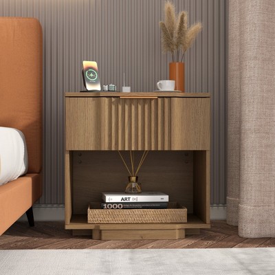 Acekool Fluted Farmhouse Nightstand with Charging Station, 23" Mid-Century Bedside Table with 2 Drawers & Open Shelf, Wood Side Table for Bedroom