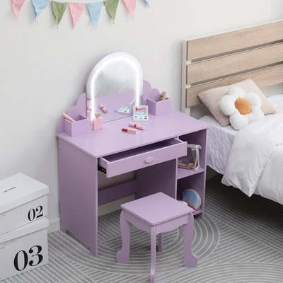 Acekool Kids Vanity with Lighted Mirror & Stool, Adjustable LED, Drawer, Storage Shelves, Makeup Desk for Girls Ages 3-9, White