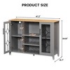 - Specifications: Industrial style wine bar cabinet for indoor use. Overall size is about 47.2 in wide x 15.7 in deep x 34.61 in high. The middle storage depth is about 14.3 in, with three vertical spaces from top to bottom of about 13.4 in, 7.9 in, and 7.9 in. Includes 4 rows of stemware racks for up to about 16 wine glasses and 2 removable wine racks for about 8 standard wine bottles. Features two side cabinets with transparent glass doors, adjustable center shelves, and a stable frame. Designed as a home bar, coffee station, or dining room storage cabinet.