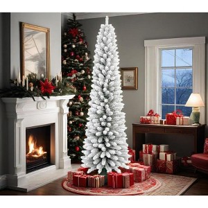 Acekool Snow Flocked Pencil Tree, PVC Mixed Flocked Needles, Hinged Slim Fir, Sturdy Base, Space Saving Corner Style, 9FT, 2024