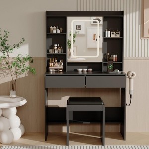 - Acekool Vanity Desk with Mirror and Lights brings both elegance and functionality to your bedroom or dressing area. Designed with ample storage and modern features, this set offers an organized and enhanced beauty space. The flip-top mirror reveals hidden storage, while deep drawers, open shelves, and a spacious desktop ensure all beauty products and accessories have their place. The set includes a plush padded stool for comfort and a secure hairdryer holder for extra convenience.