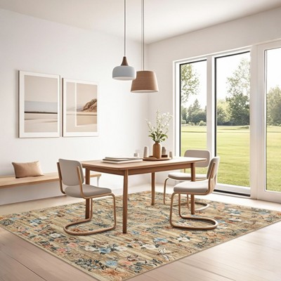 Acekool Washable 5x7 Area Rug, Modern Floral Insect Print, Non Slip Low Pile Soft Stain Resistant Indoor Carpet, Beige