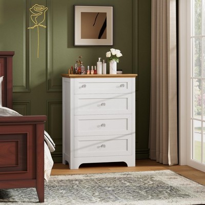 Acekool White 4 Drawer Nightstand Cabinet with Night Light, Glass Top Modern Dresser for Bedroom, Living Room, Entryway