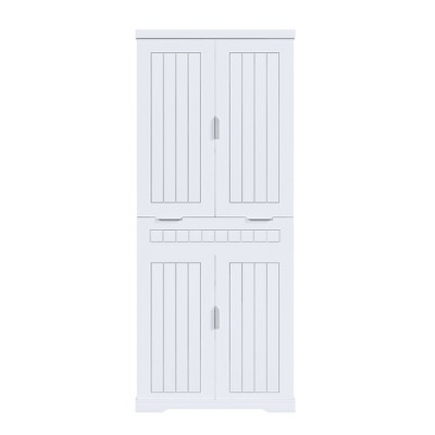 This freestanding pantry cabinet features two large compartments, a convenient pull-out drawer, and six door shelves. Four adjustable shelves (each supporting 60 lbs) offer three height configurations to accommodate everything from small kitchen appliances to bulk food items, while dedicated door shelves (supporting 10 lbs) keep spices and condiments within easy reach.