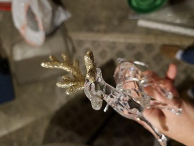 A: The main decorative feature is the glittery antlers on the see-through deer.