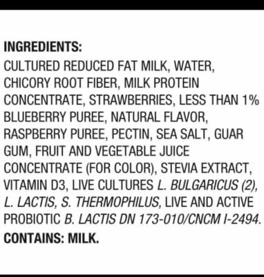 cultured reduced fat milk, water, chicory root fiber, milk protein concentrate, strawberries, less than 1% blueberry puree, natural flavor, raspberry puree, pectin, sea salt, guar gum, fruit and vegetable juice concentrate (for color), stevia extract, vitamin d3, live cultures l. bulgaricus (2), l. lactis, s. thermophilus, live and active probiotic b. lactis dn 173-010/cncm i-2494.