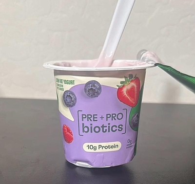[This review was collected as part of a promotion.] It has a smooth, creamy texture with a light berry flavor that isn’t too sweet. I love that it has probiotics and no added sugar, making it a healthy and convenient snack. A little pricier than regular yogurt, but worth it for the taste and digestive benefits