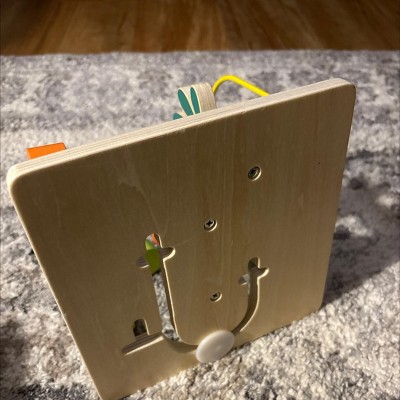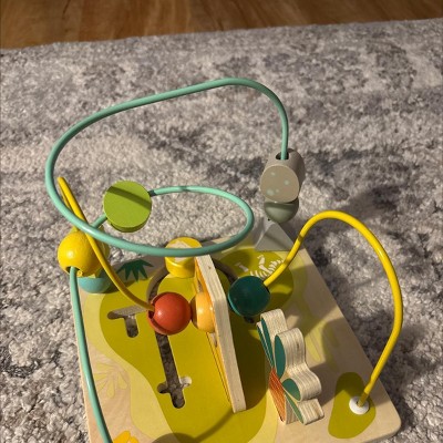 - Includes 2-way bead maze, dinosaur maze, spinning beaded wheel and shape sorter