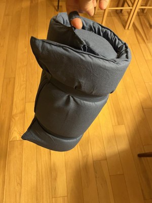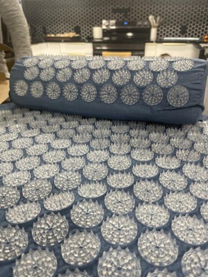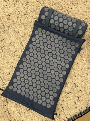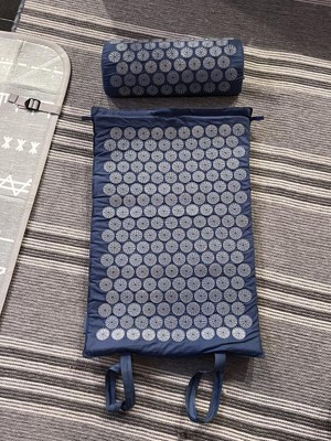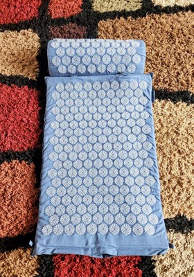 Acupressure mat and pillow set has a padded construction and features soft spikes designed to stimulate pressure points and provide relief from pain and stress. Comes in a blue color with light blue acupressure spikes. Foldable design allows for easy portability