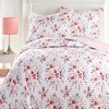 [This review was collected as part of a promotion.] This is a very pretty quilt. I love the small floral pattern with the soft colors. I also like that it’s reversible but I like the floral side much more than the plain pink and white side. It’s lovely for the spring and summer time when you’re ready for a lighter bedspread. It is thin but that’s to be expected for a quilt. The stitching is neat and clean and the material is sturdy. The only thing I don’t like about this quilt is the fabric contains polyester instead of being fully cotton. I prefer bedding to be completely cotton so I would have liked this quilt better if the material was all cotton.
