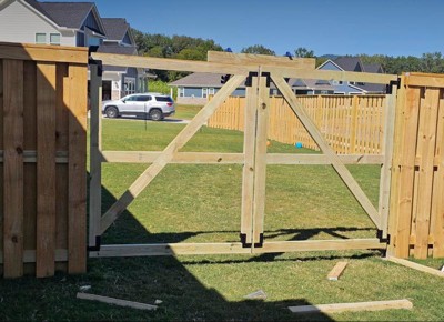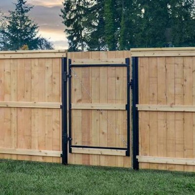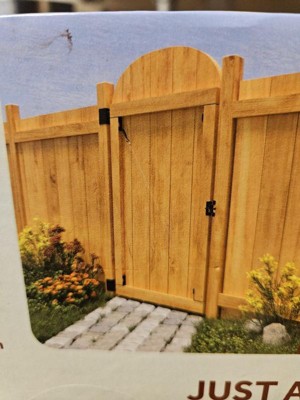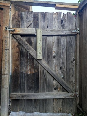 [This review was collected as part of a promotion.] It's a very sturdy gate. I bought some additional materials to make it look the way it does. The wood is very nice quality and it's not screeching and holds up in rain