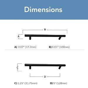 This 5" 128mm Cabinet Pull is modern and functional for a build or renovation project. Finished in a matte black, these pulls can be used on cabinets in your kitchen, bathroom or home office for a modern and sleek look. Five pulls are included within the package. The t-bar handles are made for a simple installation process that will add the finishing touch to your cabinets in no time - all hardware is included within the package. Durable and reliable, these cabinet pulls will be a staple in your home for years to come.