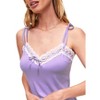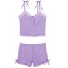 These soft knit purple PJs are both romantic and comfortable. The fitted cami has lace trim at the neck with bow-tied straps, and the shorts have small ruffle details along the hem.