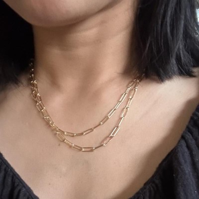 [This review was collected as part of a promotion.] I love this paper clip chain set! The contrasting sizes in chains give it extra dimension and I have already gotten so many compliments on it. It is simple enough to go with a variety of looks from dressy to casual. It fits me perfectly and is easy to clasp. I think it is great quality for the price point and would definitely recommend!
