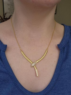 [This review was collected as part of a promotion.] I'm not a huge fan of gold, because it totally clashes with my red hair and cool undertone, but I think this Crystal Wrap Snake Necklace is pretty cool! It's got super real looking jewels in it, and the color is nice. I like the cute packaging that it came in, which was a little bag with "Adornia" on it inside of a black box. It's sparkly, and it would look great with any color clothes. Overall, I like it, but I'd rather have it in silver.