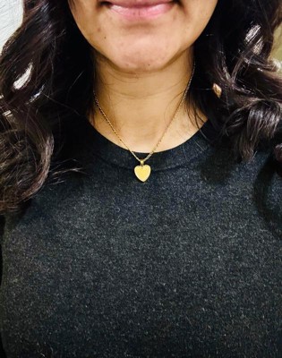 [This review was collected as part of a promotion.] This beautiful heart necklace is perfect to go with any outfit. This necklace is not too long or short it’s the perfect size. It’s a shiny gold necklace. The packaging was nice it came in a nice box with a little bag to store.